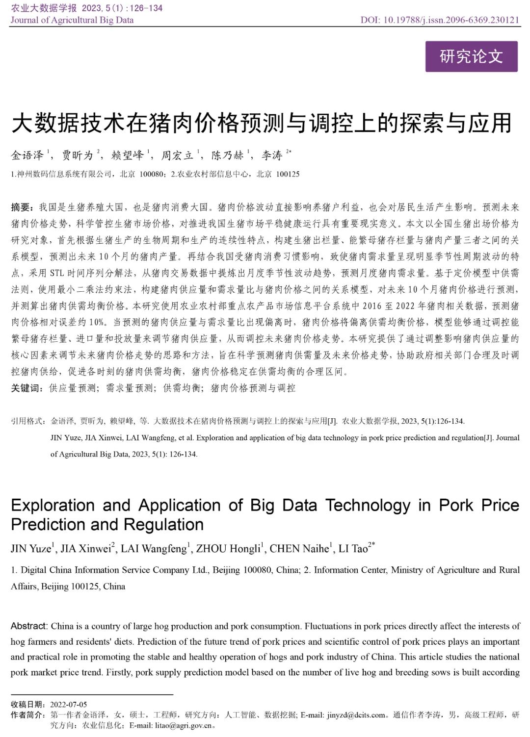 近日,神州信息在《农业大数据学报》 上发表题为《大数据技术在猪肉价格预测与调控上的探索与应用》的研究论文,一经发表便得到行业高度关注。